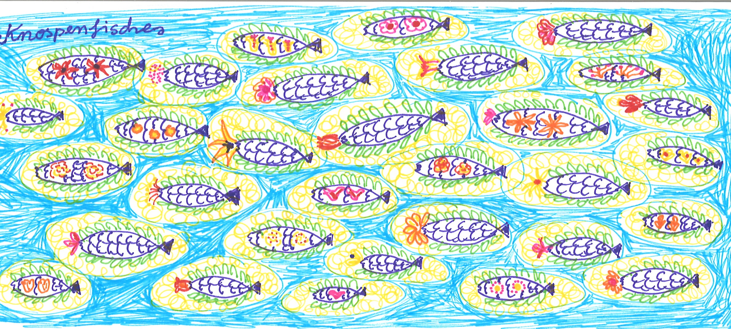 At the end we chose one word from what we‘d written for „above“ and one word for what we‘d written for „below“ and made up a hybrid word. The hybrid word would unite the two spaces with language as we had done with body work. The participant in the session came up with nosebelly, a word that actually sounds nicer in German: Nasenbauch. I came up with Knospenfische which translates into a rather more down to earth budfish. Speaking the words we‘d created out loud made us both happy and contented. It was strangely powerful. After the workshop I kept thinking about it and drew a picture of my budfish which you can see above. Whenever I look at it, it cheers me up and makes me mouth the word like a mantra: budfish.